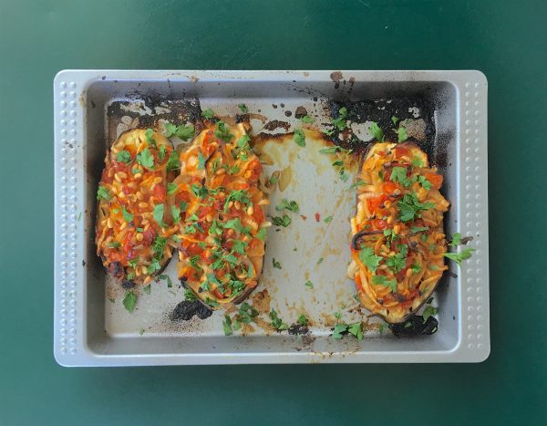 - Etaler 1 c.s. d’huile d’olive sur le fond d’un plat allant au four et y déposer les aubergines, côtés quadrillé en haut. Remplir les incisions avec un maximum de farce tomates-oignons. Répartir le reste de la farce et le jus sur le dessus des aubergines. Si une partie de la farce tombe sur les côtés, cela ne dérange pas.