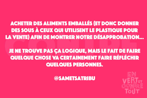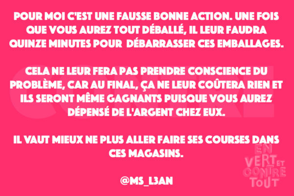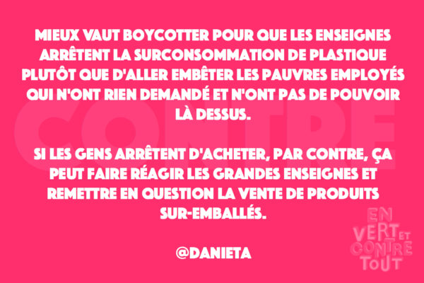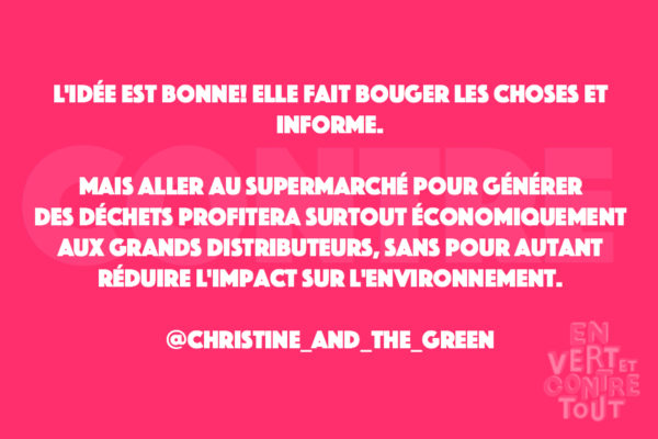 Si ce genre de mobilisations en faveur de l’environnement reste réjouissant, à la rédaction, nous avons été interpelées par les vidéos montrant des participants sélectionner les aliments les plus emballés qu’ils trouvent pour augmenter la masse de plastique déposée à l’entrée du magasin.