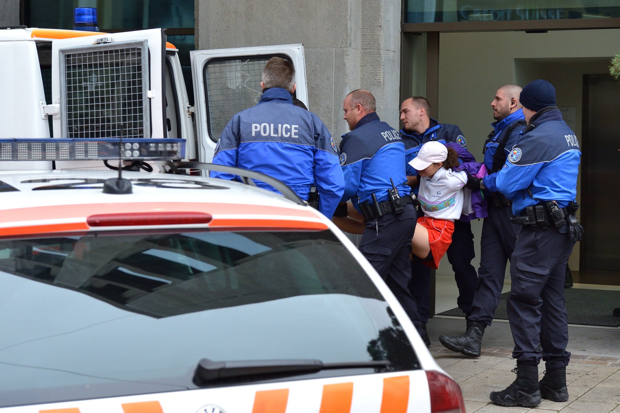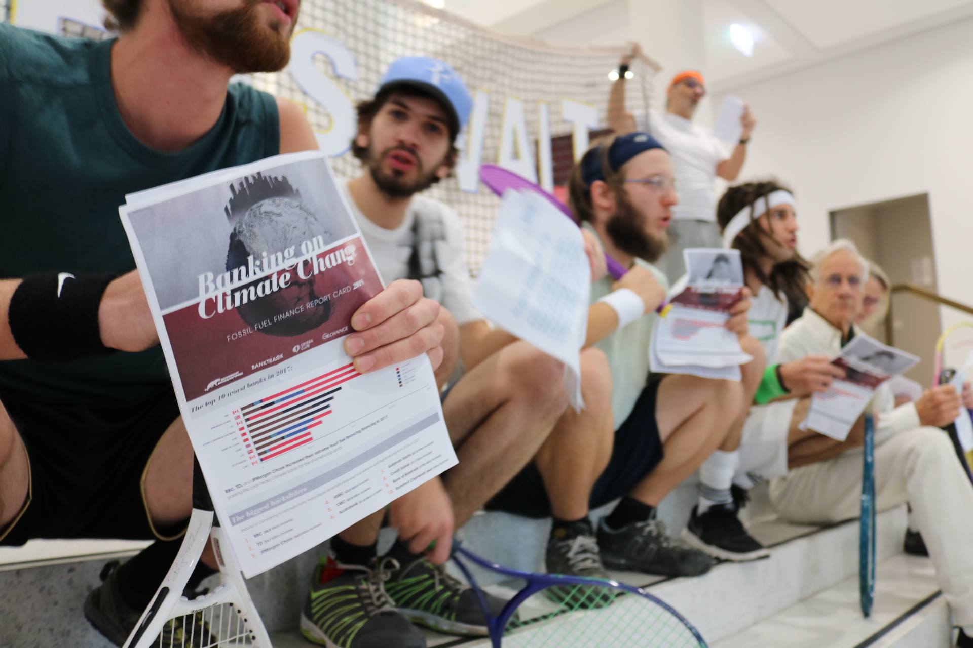 Des militants déguisés en tenniswomen/men ont pris possession des vestibules de trois succursales du Credit Suisse à Genève, Lausanne et Bâle pour y échanger quelques balles dans la bonne humeur!