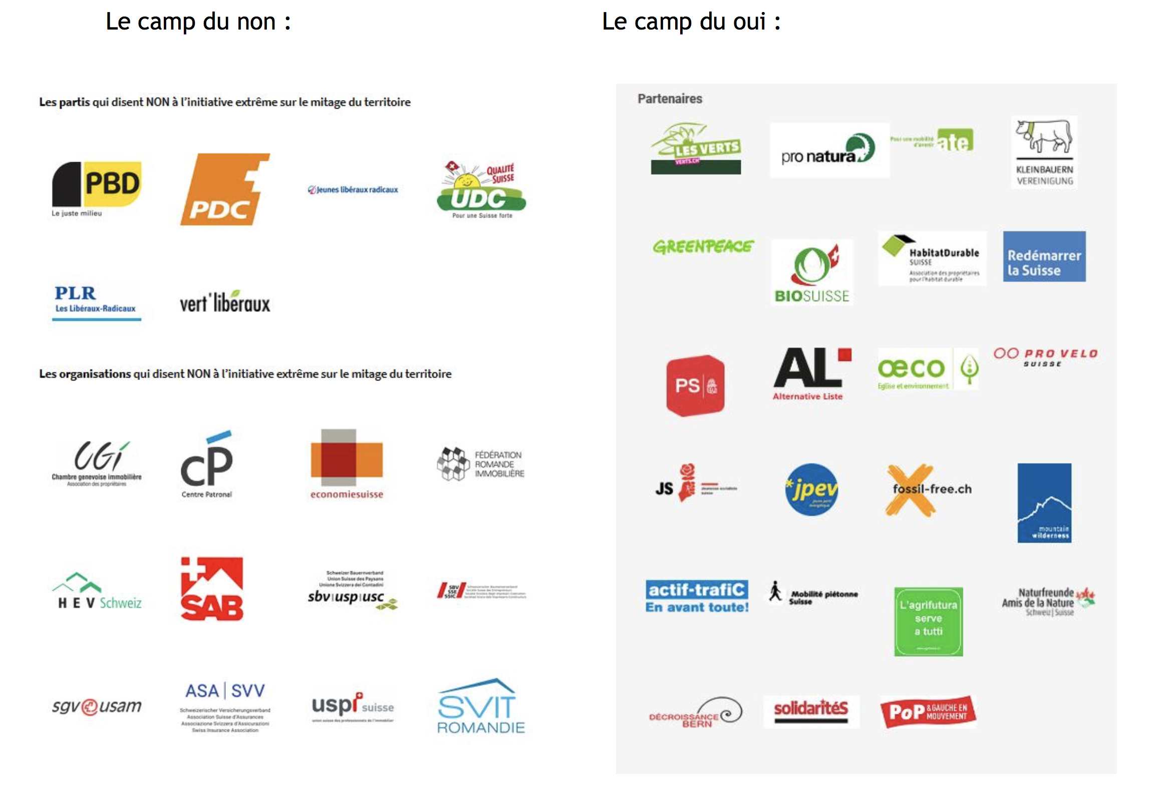 On remarque assez facilement que les opposants sont composés de bailleurs, de propriétaires fonciers, de promoteurs immobiliers, d’assureurs et d’hommes d’affaire… Alors que les soutiens à l’initiative sont de grandes associations qui luttent pour la protection de l’environnement et la fin des énergies fossiles, des paysans pratiquant une agriculture durable, des adeptes de la décroissance….
